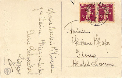 The card was sent in 1919 from the village of Rothrist-dorf in the German speaking canton of Aargau, Switzerland with a couple of their William Tell definitives first issued in 1910. It is sent to Helene from "your sister Lydie". Lovely writing but don't know what the rest says, it starts with Meine (my); possibly its a loving greeting.